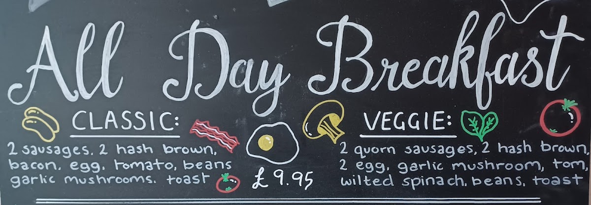 Meat: 2 sausages, bacon, egg, 2 hash browns, mushrooms, tomato, beans, toast Veggie: 2 vegan sausages, 2 egg, mushrooms, 2 hash brown, wilted spinach, tomato, beans, toast Vegan: 2 vegan sausages, 3 hash browns, garlic and parsley mushrooms, wilted spinach, tomato, beans, toast